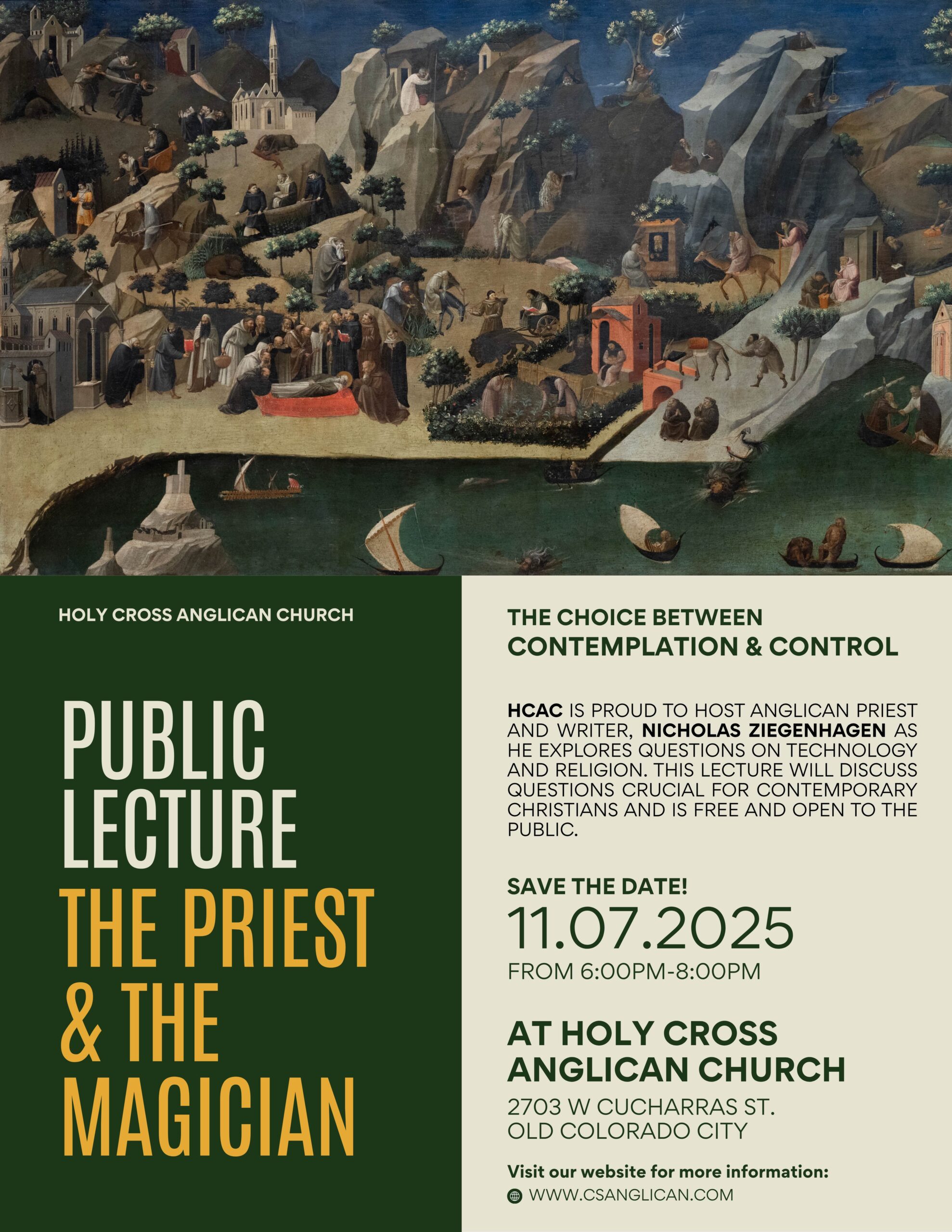 Holy Cross Anglican Church 2703 W. Cucharras St., Colorado Springs, CO, United StatesHoly Cross is hosting author and Anglican Priest, Nicholas Ziegenhagen, for a public lecture on the relationship between Christianity and technology. The lecture will start at 6:00pm and will be followed by an informal reception with light dessert and drinks. This lecture is free and open to the public.